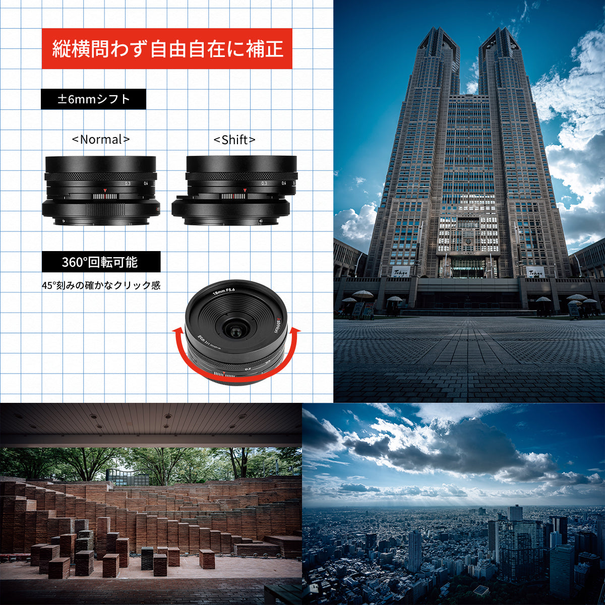 「AstrHori 18mm F5.6 Shift」は、APS-C対応の広角シフトレンズ。ロータリーシフト機構(±6mm/360°回転・45°クリック)により、構図内の水平・垂直を整えつつ自然なパースで描写可能。約169g・直径63mmの軽量コンパクト設計。高屈折率レンズとEDレンズを組み合わせたレンズ構成により歪曲や色収差を抑え、周辺までクリアでヌケの良い描写を実現。日常スナップから実用撮影まで幅広く活躍。パノラマ合成で継ぎ目の少ないワイド画を狙う、商品撮影でパースを整えて形状を正確に見せる、室内・不動産の記録で限られたスペースでもまっすぐな線を保つ、ショーウィンドーや展望台などガラス越しの撮影でシフトにより映り込みを避けるといった用途で、意図どおりの“整った一枚”を手軽に実現。APS-C設計ながら無シフト時はフルサイズ機でも実用が可能です。※周辺の描写は機種・条件により異なります。