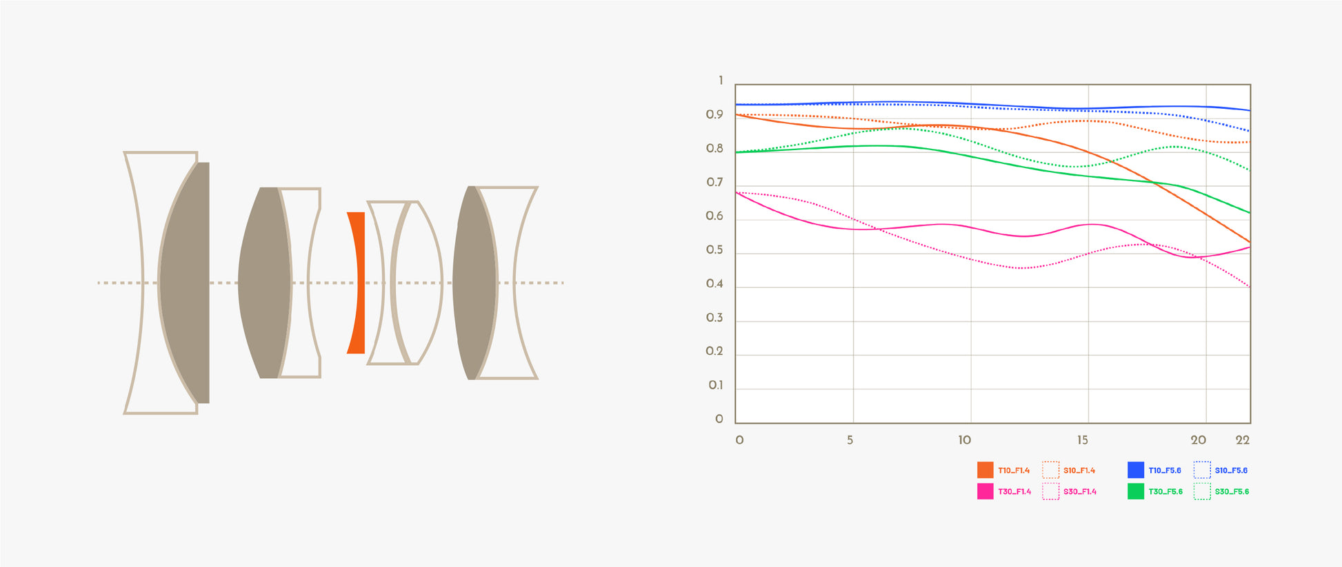 非球面レンズ1枚、高屈折レンズ3枚を組み合わせた高度な光学設計を採用。開放F1.4でも画面の隅々までシャープでクリアな描写を実現し、各種収差を効果的に抑制します。また、14枚の絞り羽根により、柔らかく美しいボケを表現。被写体を際立たせつつ、幻想的な描写を可能にします。